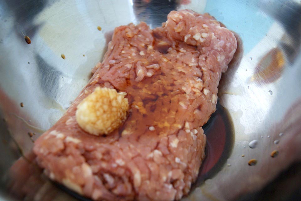 - To make the filling, marinade the ground chicken with soy sauce, sake, and minced garlic for 10 minutes. Prepare the vegetables. Slice the mushrooms, mince the carrot and green onion, and shred the cabbage.