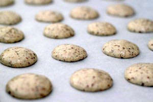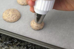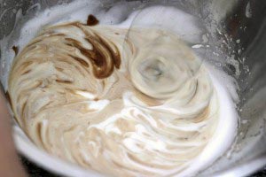 - For the shells, whip the egg whites until foamy and half the sugar. Keep whipping and gradually add the rest of the sugar. When the meringue is 60 percent complete, add the coffee extract and keep whipping. Whip until the meringue is shiny and stiff (not too stiff).