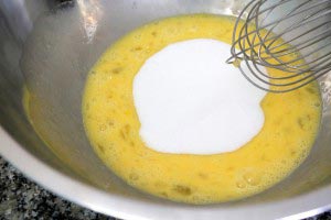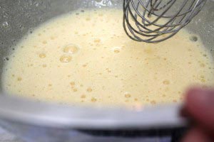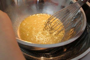 - In another large mixing bowl (smaller than the water bowl), whisk together the eggs and sugar immediately by hand until combined. Now whisk the bowl over the hot water bowl until the mixture is pale and almost tripled in volume. When the mixture is just hot enough to touch, remove from heated water bowl and add 1 teaspoon honey. Then keep whisking until you can draw a ribbon and it lasts for at least 3 seconds. You’ll have to work hard to get enough air into the batter. I made my husband whisk for 5 to 8 minutes nonstop.