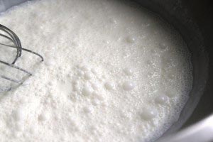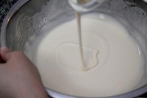 - Now, make the whipped cream. Whisk together whipped cream and sugar in an ice cold bowl until stiff. You’ll have to work hard again (you can use a hand mixer, but we prefer whipping by hand).