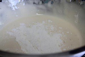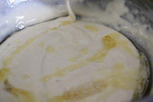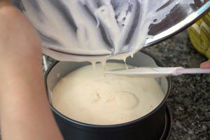 - Carefully, but swiftly fold in the cake flour using a rubber spatula. Then slowly fold in the melted butter and don’t mix too much.