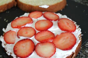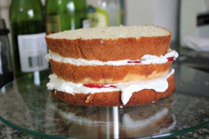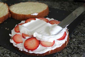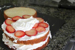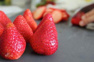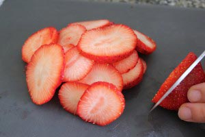 - While the sponge is cooling, slice some strawberries for the filling. Leave some whole strawberries for the topping.