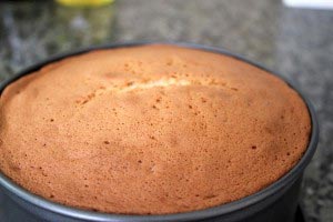 - Pour mixture over lined 7 inch cake pan and bake for 30 minutes at 350°F. When sponge is done, remove from pan but leave the baking paper on and let the sponge cool down.