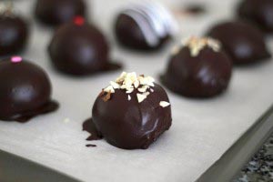 - Put the dark chocolate chips and butter in a small stainless steel bowl and melt over a hot water bowl. Stir constantly to blend. Dip the cooled cookies into the melted chocolate and put on parchment paper until chocolate sets. You can decorate with ground almonds and heart sprinkles before the chocolate hardens. If you’re in a hurry to eat the cookies, you can put the cookies in the fridge or freezer to let the chocolate harden faster.
