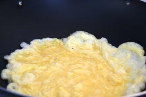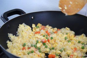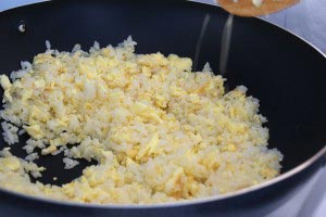 - Re-heat wok. Make sure it’s really hot and then add 3 tbsp peanut oil. When oil is hot, add the beaten eggs and stir until halfway cooked. Add rice when eggs are half way cooked and stir well. Stir until the rice grains are separated and fluffy.