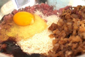 - In a large mixing bowl, add the ground pork or ground beef and mash until smooth. Lightly season with salt and pepper. Now add the cooled onion, egg, panko bread crumbs, and Japanese Worcestershire sauce