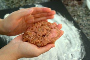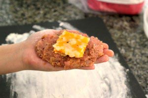 - Divide the mixture into 4 patties. Fold the cheese into quarters and fill the center of each patty. Make sure the cheese is covered on all sides with the meat mixture. Don’t make the patties too thick (it will take longer to cook and it might burn).