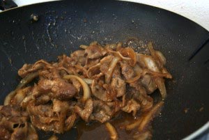 - Add the ginger sauce. Let the alcohol (sake) in the sauce evaporate over high heat and then add 1/4 cup of water. Let it simmer for a minute and continue Sautéing. Serve Shogayaki with rice and shredded cabbage.