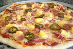 - Pre-cook the bacon before placing on pizza, and make sure to squeeze/drain the liquid from the pineapple and pepper. Spread 1 cup of sauce on the pre-baked crust and add cheese. Then top with ham, bacon, pineapple, and sliced jalapeño peppers. Bake for 15 minutes at 425 degrees F and enjoy.