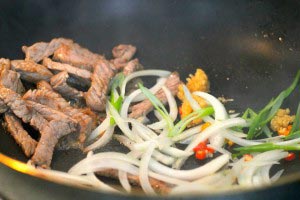 - Prepare the veggies and beef. Heat a wok and add some oil. Lightly brown the beef and then add the onion, minced garlic, green onion, and thai chili peppers. Sauté until the beef is cooked.