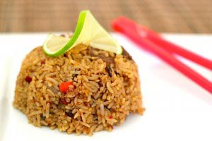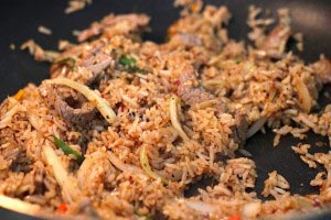 Here’s my version of the nam prik pao fried rice. For this Spicy Thai Fried Rice recipe, you’ll need roasted Thai Chili Paste (Nam Prik Pao). I’ve tried the Pantainorasingh brand and the Thai kitchen brand, but prefer the Pantainorasingh brand. It might be easier to find the Thai kitchen brand in American stores. Have all the veggies and beef sliced and ready to go. This fried rice is good by itself, but also super yummy with crispy fried egg.