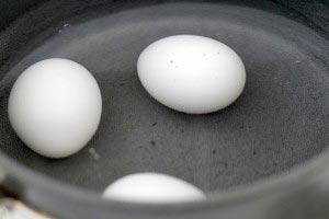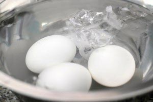 - Place the eggs in a small pot with water and vinegar and bring to a boil. Once the water boils, turn off heat, cover and leave for 15 minutes. Remove eggs and put them in a bowl of ice water. When the eggs have cooled a bit, drain the water and peel and dice the eggs into small cubes.