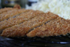 in hot oil for 2 minutes or until golden brown. Serve with shredded cabbage and tonkatsu sauce.