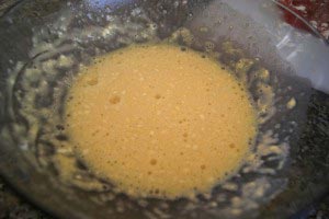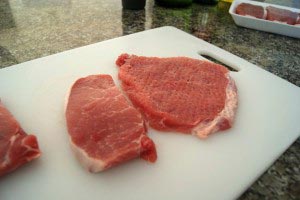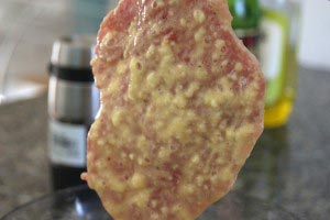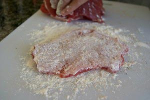 - In a small mixing bowl, beat two large eggs. Add 1 1/2 tablespoon of flour and mix well with beaten egg. Lightly coat both sides of the meat with flour.