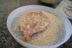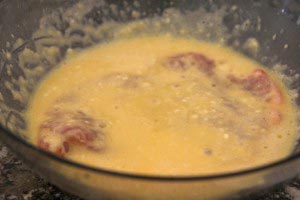 - Dip each flour coated meat into the egg mixture. Then shake off excess egg.