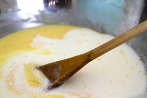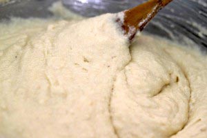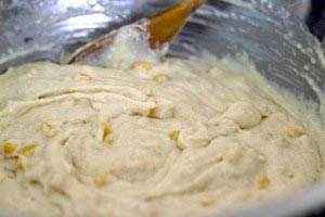 - Add the buttermilk and stir in the flour/cornmeal mixture. Mix well again.